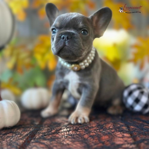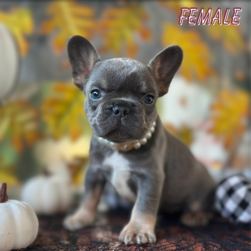 Meet Hattie: Graceful, glowing, and impossible to ignore—Hattie is a tri-colored blue French Bulldog with a look that turns heads and a presence that warms hearts. Her coat is a striking blend of blue, tan, and white, with four uniquely placed tan “socks” that add a touch of playful elegance to her already captivating style.