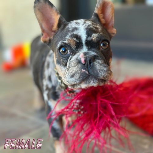 Miss Madison a tri-merle Frenchie with a coat as captivating as her spirit—swirls of blue, tan, and white dance across her frame like a painter’s dream. Madison is the kind of pup who turns heads and melts hearts in the same breath. Sweet as morning sunshine, smart as a whip, and fiercely independent, she’s got a personality that sparkles just as much as her unique coloring. Whether she’s striking a pose or solving her own little puzzles, Madison is pure magic in motion.